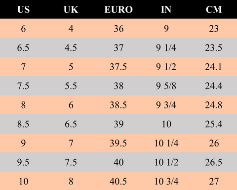 • Runs true to size, If you have a wider foot we recommend sizing up, more narrow foot size down.