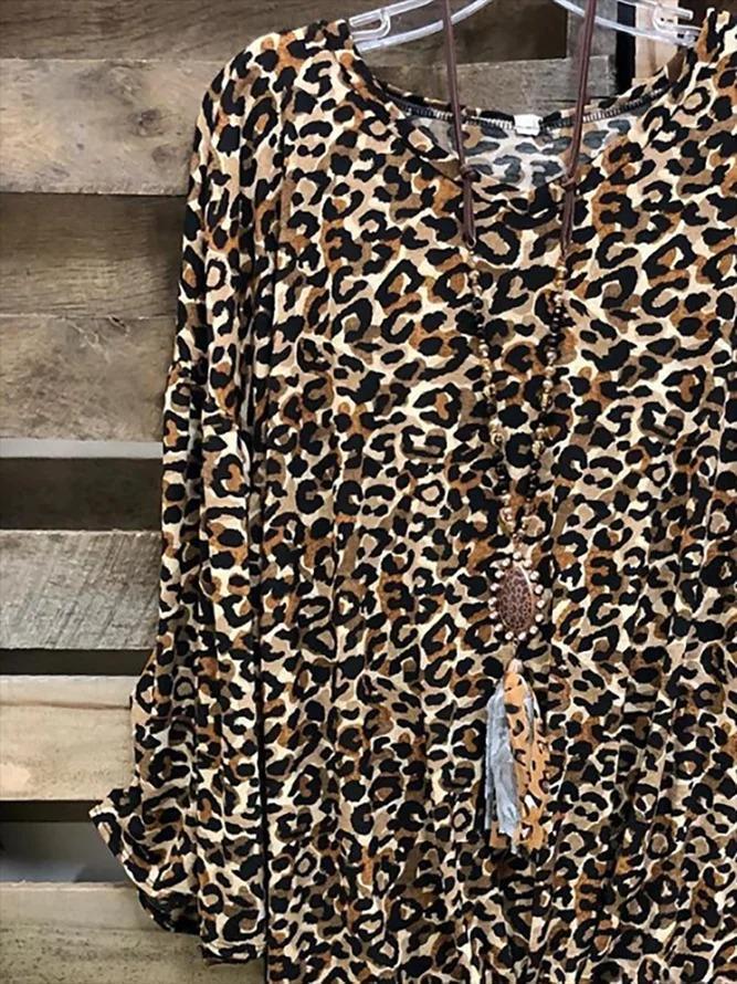 💥QVC Recommend💥Brown Leopard Crew Neck Long Sleeve Cotton-Blend Shirts & Tops