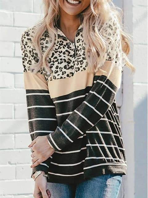 💥QVC Recommend💥Leopard Print Srtiped Stitching Zipper Sweatshirt