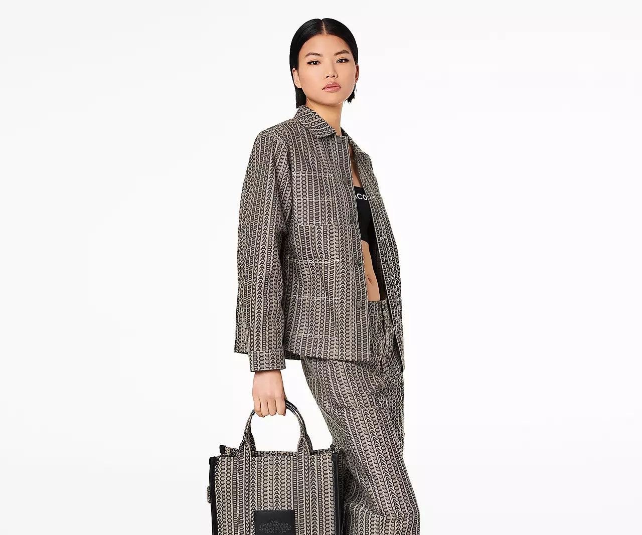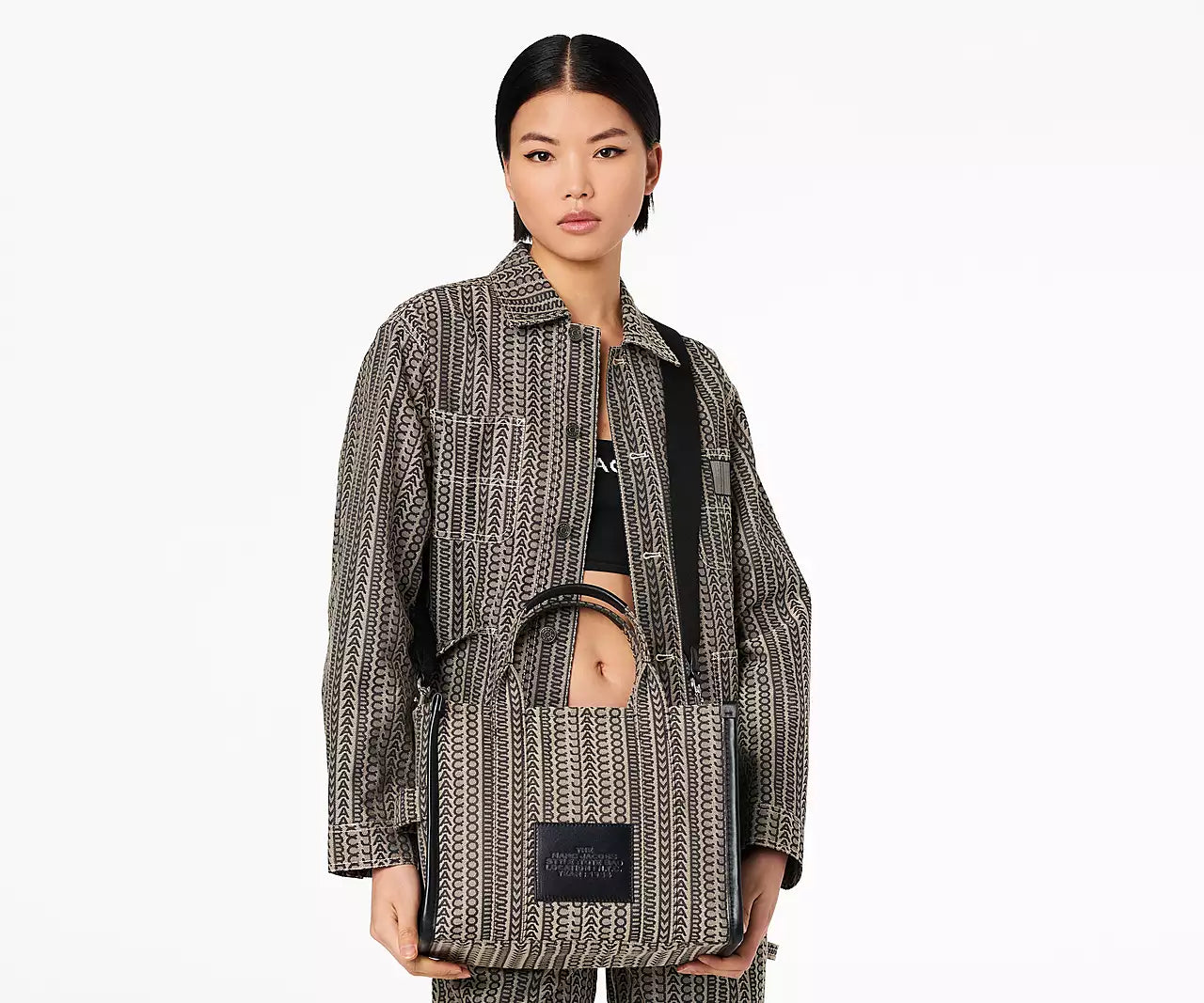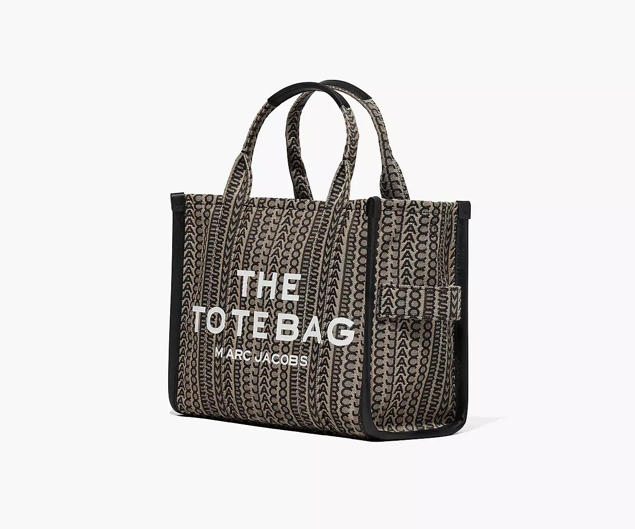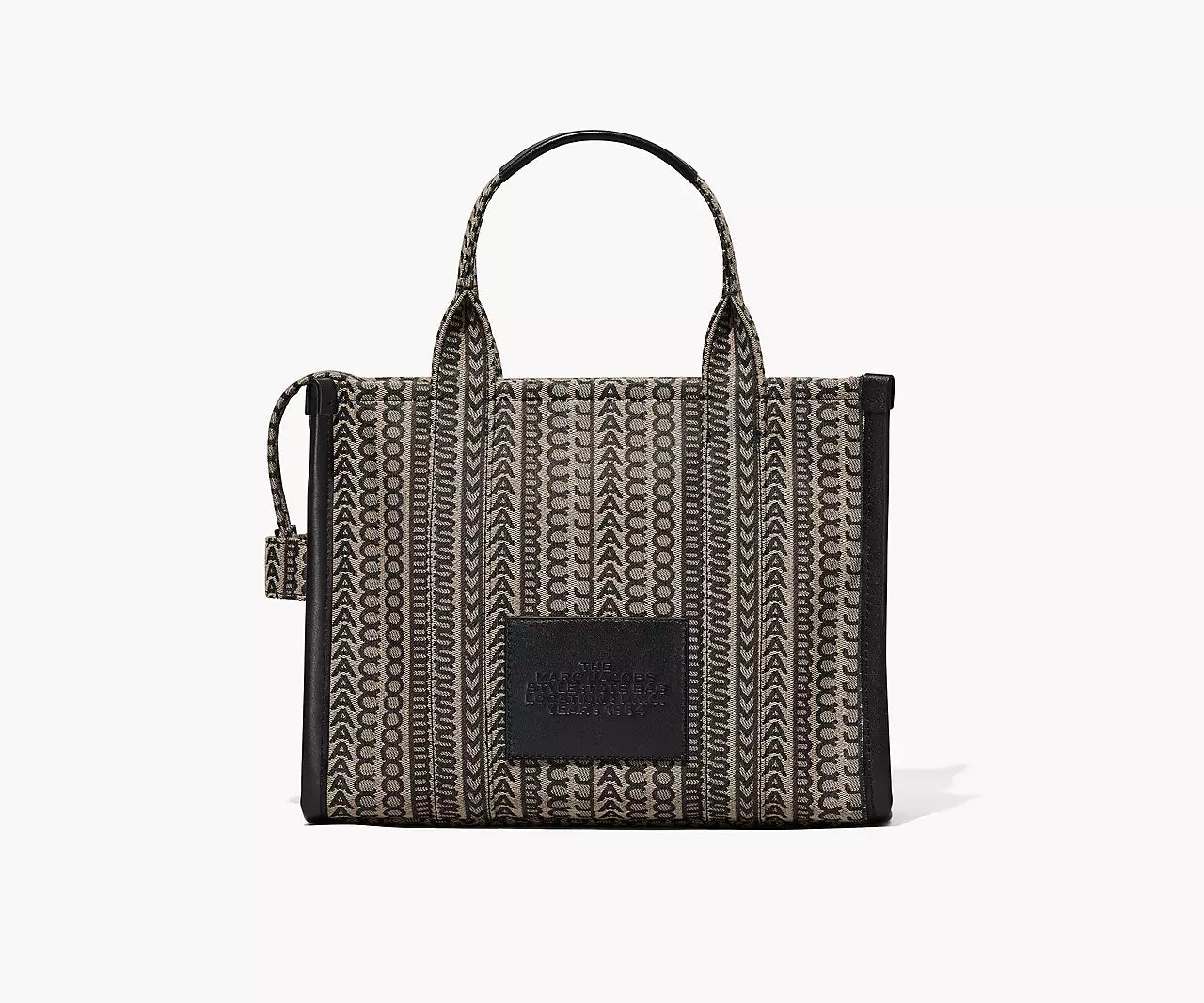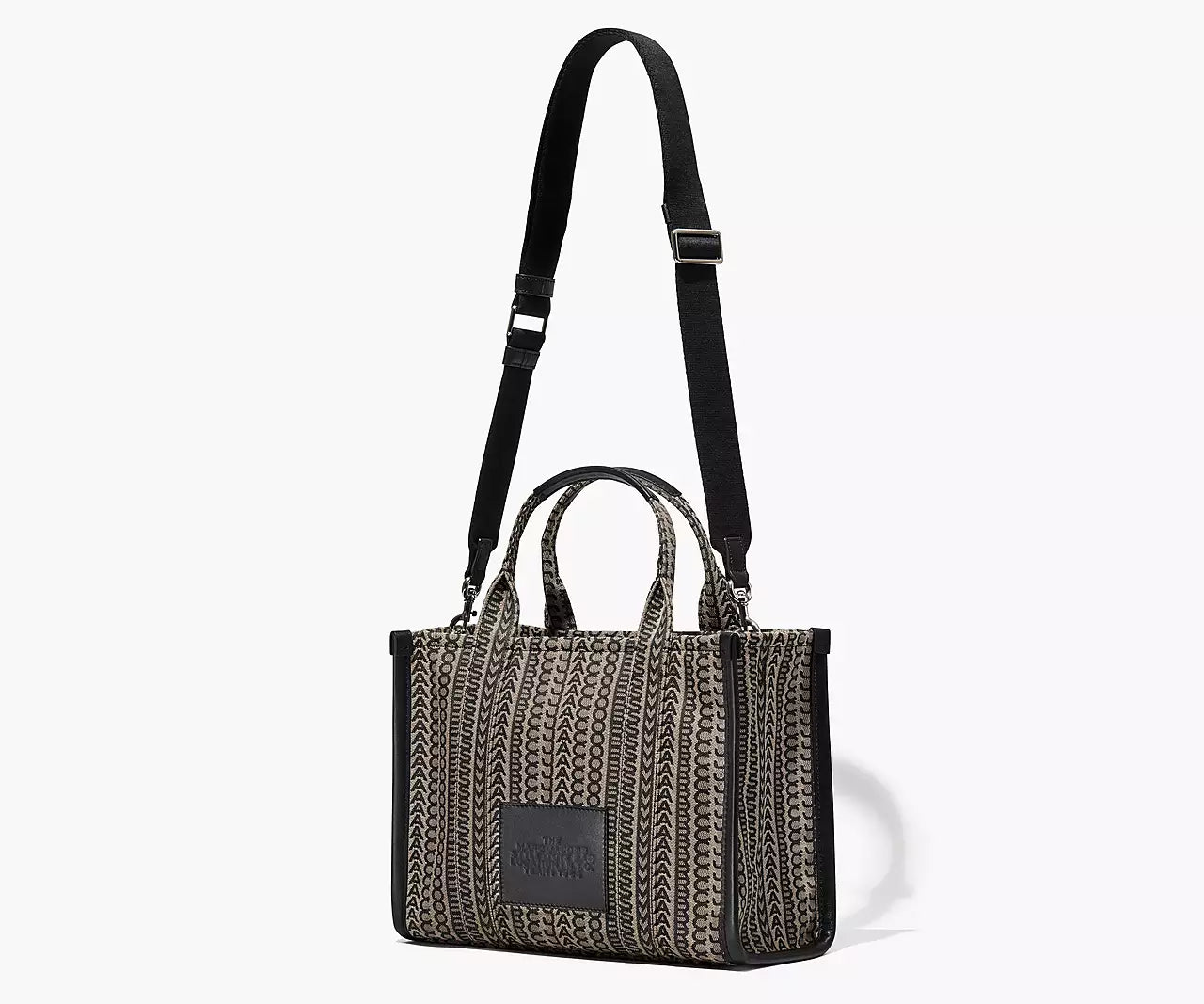 The monogram appears on an everday tote made in rich jacquard. Wear it by the leather handles or go handsfree via the removable crossbody strap. Refer to our size guide to view all the different tote bag offerings.